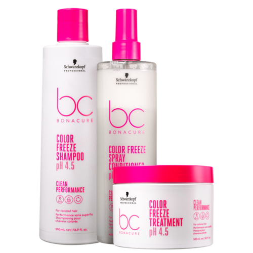 Kit com shampoo, máscara e leave-in para cabelos coloridos em tamanho profissional. Schwarzkopf Professional BC Bonacure Clean Performance Color Freeze Profissional tem pH 4.5 que reequilibra a estrutura do cabelo para um nível de pH ideal, além de proteger a cor dos fios, evitando o desbotamento.