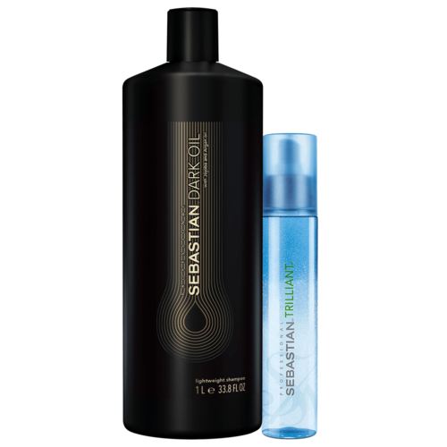 Kit com shampoo e protetor térmico para todos os tipos de cabelo. Sebastian Professional Flaunt Trilliant + Dark Oil Shampoo proporciona uma ação super completa e efetiva, pois trata os fios enquanto higieniza e protege.
