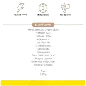 ----------------------------------------------- Mobilar Eletro ------------------------------------------------ Há 25 anos no mercado de eletrodomésticos, vendendo produtos que te auxiliam nas atividades do dia a dia, trazendo sofisticação e conforto para a sua casa, e qualidade de vida para você e sua família --------------------------------------------------------------------------------------------------------------------- KIT secador multilaser 2000wts dourado + chapinha ionizada bivolt dourada Se um já era perfeito , dois é tudo de bom para quem tem preguiça de ir ao salão, ao não tem tempo. Rapidinho você mesmo modela , seca ou alisa os cabelos com essa super dupla. O secador possui 2 velocidades e 3 combinações de temperatura, ajuste facilmente pelos botões para deixar o cabelo da maneira como desejar. Além disso, o Secador de Cabelo Multilaser Beauty conta com bocal direcionador de ar, possibilitando a modelagem dos seus fios e otimizando ainda mais a secagem dos seus cabelos. A Chapinha Modeladora Gold, com as pontas arredondadas você pode finalizar seu penteado entre liso e cacheado e estar sempre mudando Com tecnologia TOURMALINE ION, funciona através de íons negativos que neutralizam os fios fechando as escamas e reduzindo o frizz. Chapas Flutuantes que se adequam-se às mechas garantindo um alisamento uniforme das mechas. Função Trava Chapa, excelente para acelerar o aquecimento e guardar o produto Além de possuir design anatômico, LED indicativo de funcionamento e cabo de energia giratório 360º que garante a segurança e facilidade no manuseio. Marca: Não Informado Ean: 7890242403683