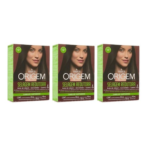 Descrição: O Kit Selagem/Redutora Origem Castanhos é um tratamento capilar que promove a redução do volume e do frizz dos cabelos castanhos. Sua fórmula exclusiva conta com Queratina Vegetal e os óleos de argan, macadâmia e karité, que nutrem e regeneram profundamente os fios, proporcionando um liso com movimento natural. Modo de usar: Lave os cabelos com o Shampoo Antirresíduos, massageando suavemente. Enxágue bem e seque os cabelos com uma toalha. Divida os cabelos em mechas e aplique a Selagem Redutora, enluvando-as bem. Deixe o produto agir por 30 minutos. Enxágue bem e finalize com o Condicionador Matizante. MS AFE 2.01118-2 Shampoo Antirresíduos 25351.159402/2014-67 Redutor de Volume Condicionante 25351.169931/2018-18 Máscara Reconstrutora Condicionante Matizante Castanho 25351.972225/2020-62