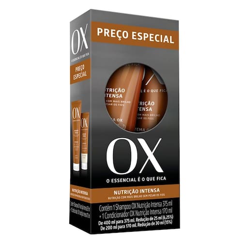 O Kit Shampoo 375ml+Condicionador 170ml Ox Nutrição Intensa recupera profundamente os fios sem pesar. Com a combinação dos poderosos óleos essenciais de cálamo, mirra e oliva, nutrem intensamente os fios, limpando-os suavemente. Além disso, garante brilho e movimento por mais tempo. Sua formulação é livre de sal, óleos minerais e silicones pesados, com fragrâncias fixadoras e concentradas. Benefícios: - Hidratação intensa; - Não pesa os fios; - Brilho luminoso. Modo de usar: Aplique o shampoo nos cabelos molhados e massageie o couro cabeludo delicadamente, em seguida enxague. Em seguida aplique o condicionador no comprimento dos fios e logo após enxague.