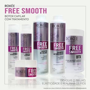 OBotox FREE SMOOTH ROKÉE Professional, possui em sua fórmula ativos de alta performance que combinados com extratos mineras e poder do Blend de 11 óleos vegetais, que trata os fios de dentro para fora.