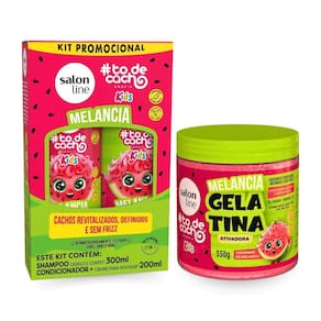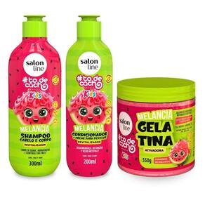 Contém: 01 - Shampoo Cabelo e Corpo Revitalizador Melancia 300ml, Salon line; 01 - Condicionador + Creme Para Pentear Revitalizador Melancia 200ml, Salon Line; 01 - Gelatina Hidratante de Cachos Melancia 550g, Salon Line.
