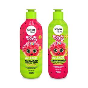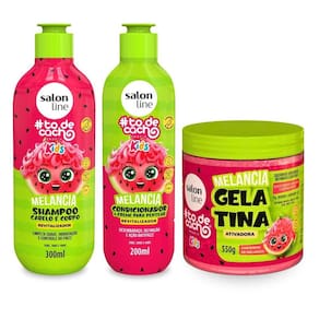 Contém: 01 - Shampoo Cabelo e Corpo Revitalizador Melancia 300ml, Salon line; 01 - Condicionador + Creme Para Pentear Revitalizador Melancia 200ml, Salon Line; 01 - Gelatina Hidratante de Cachos Melancia 550g, Salon Line.