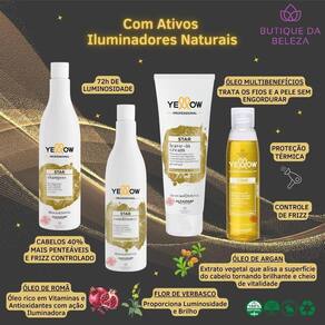 Kit shampoo condicionador leave-in e óleo yellow starEste kit contém01 shampoo yellow star 500ml01 condicionador yellow star 500ml01 leave-in yellow star 250ml01 óleo nutritive yellow star 120mlYellow star é a linha vegana com princípios ativos 100% naturais e sustentáveis, que realçam a luminosidade natural dos cabelos.Ativos da linhaÓleo de arganRico em ômegas 3, 6, e vitamina e, que revitalizam o fio e devolvem toda a vida e beleza.Óleo de cocoProfundamente nutritivo e emoliente, também é rico em vitamina e. Repõe todos os ingredientes necessários ao fio saudável.Indicado- cabelos opacos.- cabelos com frizz.- cabelos com necessidade de luminosidade.- todos os tipos de cabelos.- cabelos secos ou ressecados.Benefícios- cabelos com 35% mais brilho.- cabelos com 40% mais penteabilidade.- poder iluminador de 72h.- maciez instantânea.- hidratação intensa.- limpeza.- proteção térmica.- controla o frizz.- reduz o ressecamento.- shampooO shampoo para brilho yellow star deixa seus cabelos mais luminosos, leves e fáceis de desembaraçar a partir do primeiro uso.- condicionadorO condicionador yellow star traz uma fórmula que hidrata e proporciona maciez sem pesar os fios, além de deixar seus cabelos desembaraçados e com uma luminosidade como nunca visto antes.- leave-inAplicado antes da secagem, o leave-in creme iluminador yellow star ajuda a controlar o frizz, facilitando o desembaraço e a penteabilidade dos cabelos. Indicado para todos os tipos de cabelos.Sua fórmula ainda contém protetor térmico, que protege seus fios do calor do secador, facilitando ainda mais seus penteados.- óleoÓleo capilar iluminador leve yellow star para cabelos ressecados. Yellow nutritive oil retém a umidade dentro do fio e proporciona brilho incrível.Preciosas gotas de brilho que, além de controlar o efeito crespo e proteger do calor, iluminam cabelos e corpo sem engordurar. Dica butique da belezaVocê sabia que o óleo da linha yellow star pode ser aplicado no cabelo e no corpo São 2 produtos em 1: trata os fios e a pele.Modo de uso ShampooAplicar sobre o couro cabeludo e cabelos molhados. Massagear delicadamente e depois enxaguar. CondicionadorCom cabelo úmido, aplicar ao longo dos comprimentos e das pontas, deixar agir de 2 a 3 minutos.Enxaguar. Leave-inEspalhe igualmente no cabelo muito úmido e prossiga com a secagem e, ou penteado. ÓleoDistribuir uma pequena quantidade de produto no comprimento e nas pontas. Proceder à secagem e/ou styling. Pode ser aplicado como produto de acabamento nos cabelos secos. Dica butique da belezaPara melhores resultados, use a linha completa yellow star.