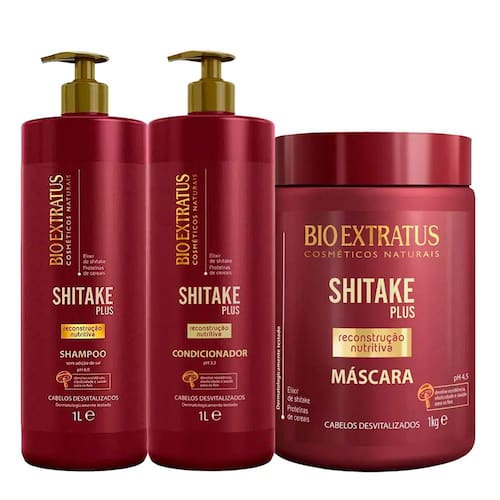 O Kit Shampoo + Condicionador + Máscara Bio Extratus Shitake Plus foi especialmente desenvolvido pra garantir uma limpeza suave, pois combina o poder nutritivo do elixir de Shitake com a ação reconstrutora das proteínas de cereais. Hidrata, revitaliza os fios e oferece os nutrientes essenciais para restauração da fibra capilar. Além disso, recupera a vitalidade e promove brilho intenso aos cabelos. Sua fórmula conta com proteínas de cereais e elixir de shitake para cabelos desvitalizados ou danificados, hidratando e recompondo a fibra capilar. Sua ação é prolongada e o efeito duradouro.
