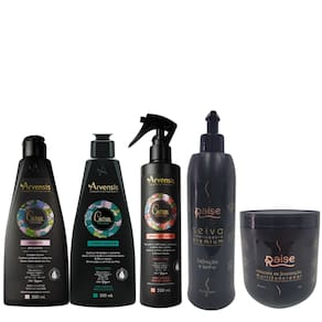 Kit composto por shampoo, condicionador, spray day after, seiva e mascara raise