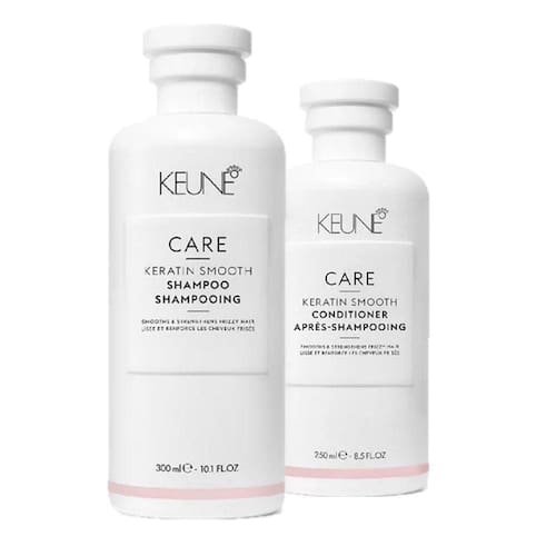 Kit shampoo e condicionador keratin smooth keune home care n care keratin smooth shampooShampoo regenerador com infusão de queratinas que fortalece os fios danificados e diminui o frizz.Adequado paraCabelos danificados devido a processos químicos.Care keratin smooth shampooIndicado para a reconstrução de áreas fragilizadas nos cabelos finos a médios, principalmente aquelas com danos causados por mechas e alisamentos, o care keratin smooth shampoo aumenta a defesa dos fios de dentro para fora. Sua fórmula repõe a fibra capilar perdida nas agressões químicas sofridas pelo cabelo.Como usar: aplique o shampoo no cabelo molhado e massageie o couro cabeludo e os fios suavemente. Enxágue e, se necessário, repita a aplicação.Resultado: cabelo mais resistente a agressões e quebra, maleável e com brilho.Ingredientes ativos:Queratinas líquida, hidrolisada e oxidada : restauram e protegem a estrutura do fio.Pró-vitamina b5: penetra profundamente no fio e regula o equilíbrio da umidade.Complexo quat: protege contra a quebra possibilitando que o cabelo molhado seja penteado com suavidade.Silsoft: regula o equilíbrio da umidade e controla o frizz.A fórmula contém:Aqua water , sodium laureth sulfate, cocamidopropyl betaine, decyl glucoside, peg-200 hydrogenated glyceryl palmate, sodium chloride, glycol distearate, glyceryl laurate, panthenol, peg-120 methyl glucose dioleate, peg-60 hydrogenated castor oil, polysilicone-18 cetyl phosphate, peg-7 glyceryl cocoate, polyquaternium-10, sodium benzoate, cocamide mea, citric acid, methoxy peg/ppg-7/3 aminopropyl dimethicone, parfum fragrance , propylene glycol, laureth-10, hydroxypropyltrimonium corn/wheat/soy amino acids, formic acid, hydrolyzed keratin, keratin, oxidized keratin, saccharomyces/magnesium ferment, phenoxyethanol, saccharomyces/iron ferment, saccharomyces/ zinc ferment, saccharomyces/copper ferment, saccharomyces/silicon ferment, hexyl cinnamal, limonene, linalool.Sugerimos ler as informações e orientações de uso descritas na embalagem antes de usar o produto. --------------------Care keratin smooth conditionerCondicionador com alto poder hidratante para cabelos finos a médios, com mechas e alisamentos.Adequado paraCabelos danificados devido a processos químicos.Keratin smooth conditioner é um potente condicionador para cabelos finos médios, com mechas e alisamentos, que hidrata e desembaraça os fios. Também ajuda a encorpar, a nutrir e a fortalecê-los, deixando-os fáceis de lidar, além de realçar o brilho. O resultado é um visual bonito e cabelos maleáveis, menos vulneráveis à quebra.Como usar: com os cabelos limpos e úmidos, aplique uma quantidade suficiente de produto por toda a extensão dos fios, principalmente nas pontas. Enxágue completamente.Resultado: cabelos restaurados e protegidos contra o calor e a quebra.Ingredientes ativos:Complexo quat: protege contra a quebra e possibilita que o cabelo molhado seja penteado com suavidade.Queratinas: restauram e protegem a estrutura do fio.Pró-vitamina b5: penetra profundamente no fio e regula o equilíbrio da umidade.Manteiga de karité: condiciona e dá brilho ao cabelo opaco.Silsoft: envolve o fio com um filme que controla o equilíbrio da umidade.A fórmula contém:Aqua water , cetearyl alcohol, paraffinum liquidum mineral oil , cetrimonium chloride, behentrimonium chloride, butyrospermum parkii shea butter, lactic acid, sodium benzoate, silicone quaternium-22, oleyl erucate, polyquaternium-37, isopropyl alcohol, panthenol, polysilicone-18 cetyl phosphate, ppg-3 myristyl ether, parfum fragrance , propylene glycol, polyquaternium-10, ppg-1 trideceth-6, hydrolyzed keratin, keratin, oxidized keratin, phenoxyethanol, hydrolyzed silk, saccharomyces/magnesium fermen n