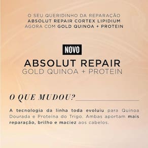 O kit contém: 01 Shampoo Loreal Professionnel Absolut Repair Gold Quinoa + Protein 1,5 Litro 01 Condicionador Loreal Professionnel Absolut Repair Gold Quinoa + Protein 1,5 Litro