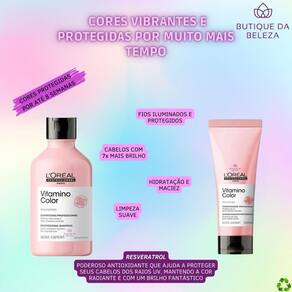 Kit Shampoo E Condicionador Loreal Vitamino Color Este kit contém 01 shampoo loreal vitamino color resveratrol 300ml 01 condicionador loreal vitamino color resveratrol 200ml Somos a butique da beleza Uma empresa especializada no comércio de cosméticos e semijoias. Estamos sempre entre os melhores vendedores. Nosso compromisso é com você Seu conforto e segurança são nossos propósitos Servir e ajudar são nossos deveres Ativos Resveratrol Poderoso antioxidante extraído da casca da uva, ajuda a proteger os cabelos contra os radicais livres, e os raios uv, responsáveis pela degradação da cor. Indicado - cabelos com coloração. - cabelos com mechas. - cabelos danificados. - cabelos desbotados. - cabelos secos. - cabelos ressecados. - cabelos opacos. - cabelos desidratados. - cabelos frágeis. - todos os tipos de cabelos Benefícios - limpeza suave. - manutenção da cor. - brilho. - preservação da cor. - cores vibrantes. - proteção uv. - proteção antioxidante. - restauração. - hidratação. - maciez. - restauração. Shampoo loréal professionnel vitamino color resveratrol Shampoo loreal vitamino color, feito para cabelos coloridos, com uma fórmula que limpa suavemente sem agredir os fios, é o primeiro passo para deixar seus cabelos com as cores vibrantes e protegidas por muito mais tempo. O shampoo vitamino color resveratrol conta com fórmula antioxidante que evita os danos do dia a dia e o desbotamento. Enriquecido com resveratrol, ajuda a restaurar e proteger contra os radicais livres, agentes oxidantes e os raios uv, responsáveis pela degradação da cor. Condicionador loréal professionnel vitamino color resveratrol Condicionador de tratamento para cabelos coloridos. Promove proteção e manutenção da cor, deixando seus cabelos hidratados e iluminados. O condicionador vitamino color resveratrol tem fórmula com um poderoso antioxidante que protege contra os radicais livres e agentes oxidantes que agridem e desbotam a cor. O resultado é um cabelo macio e hidratado, com 8 semanas de proteção da cor e com 7x mais brilho. Modo de uso Shampoo Com os cabelos molhados, aplique uma pequena quantidade no couro cabeludo e massageie até surgir espuma. Enxágue. Condicionador Com os cabelos lavado e úmido, aplique no comprimento e pontas. Deixe agir por alguns instantes. Enxágue bem. Dica butique da beleza Para melhores resultados, use a linha completa vitamino color, de loréal.