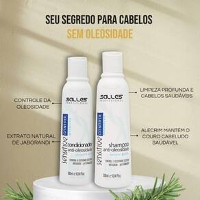Shampoo Anti-Oleosidade Sensitive Salles , Tratamento controle da Oleosidade e Anti Queda Limpa profundamente, removendo a oleosidade excessiva e os resíduos químicos de outros produtos, e da poluição, couro cabeludo mais limpo. É o produto ideal na higiene diária dos cabelos para pessoas que tem a tendência de queda de cabelos. Para o sucesso e cuidados com os cabelos, complete a lavagem com o Condicionador Anti-Oleosidade Sensitive Control Salles . Contem: Extrato natural de Jaborandi Policarpus Jaborandi H que atua a nível das raízes e bulbos capilares, revigorando e facilitando o crescimento dos cabelos. Alecrim ajudam a manter a saúde do couro cabeludo e balancear o excesso de oleosidade, prevenindo o aparecimento da caspa. Passo a Passo: Aplique o Shampoo Anti-Oleosidade Sensitive Control Salles , massageando os cabelos durante alguns minutos para assegurar a plena ação dos ingredientes ativos. Enxaguar. Para um Melhor resultado Após utilizar o Shampoo Anti-Oleosidade Sensitive Control Salles , aplique o Condicionador Sensitive no cabelo ainda molhado. Massageie o couro cabeludo. Deixe agir de 1 a 2 minutos e enxágue. Para obter melhores resultados, use diariamente. Efeito: Cabelos brilhantes e com vitalidade Condicionador Anti-Oleosidade Sensitive Salles , Tratamento controle da Oleosidade e Anti Queda Nutre profundamente, controlando a oleosidade. O couro cabeludo mais limpo facilita a absorção do com aminoácidos, o Condicionador Anti-Oleosidade Sensitive Control repõe a proteína e nutre profundamente o couro cabeludo. Contem: Extrato natural de Jaborandi Policarpus Jaborandi H que atua a nível das raízes e bulbos capilares, revigorando e facilitando o crescimento dos cabelos. Alecrim ajudam a manter a saúde do couro cabeludo e balancear o excesso de oleosidade, prevenindo o aparecimento da caspa. Passo a Passo: Após utilizar o Shampoo Anti-Oleosidade Sensitive Control Salles , aplique o Condicionador Sensitive Control no cabelo ainda molhado. Massageie o couro cabeludo. Deixe agir de 1 a 2 minutos e enxágue. Para obter melhores resultados, use diariamente. Efeito: Cabelos brilhantes e com vitalidade Marca: Não Informado