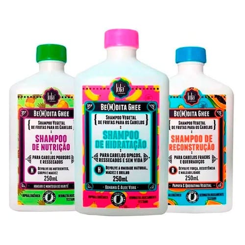 Shampoo de Hidratação Banana e Aloe Vera.Shampoo de hidratação para cabelos opacos e sem brilho, necessitados de reposição hídrica. Repõe a umidade natural dos fios ressecados, devolvo maciez, brilho e flexibilidade.Modo de Usar: Aplique nos cabelos molhados e massageie delicadamente até fazer espuma. Repita a operação se necessário.Shampoo de Nutrição Abacaxi, Girassol & Manteiga de Karité.Shampoo nutritivo com fórmula leve que limpa suavemente e devolve os nutrientes, deixando os cabelos macios e mais fortes. Devolve os lipídios, a oleosidade e umidade natural presente nos fios, vitalidade e corpo, acabando com o aspecto poroso e ressecado dos cabelos.Modo de Usar: Aplique nos cabelos molhados e massageie delicadamente até fazer espuma. Repita a operação se necessário.Shampoo de Reconstrução Papaya & Queratina Vegetal.Shampoo reconstrutor com fórmula leve que limpa suavemente, restaurando os cabelos quebradiços e fracos. Repõe a massa perdida dos fios após processos químicos, mecânicos e ambientais. Devolve também resistência e força, repondo os aminoácidos necessários para acabar com a quebra e os fios elásticos, trazendo de volta sua maleabilidade natural.Modo de Usar: Aplique uma pequena quantidade nos cabelos úmidos, massageie suavemente e enxágue em seguida. Repita a operação se necessário.