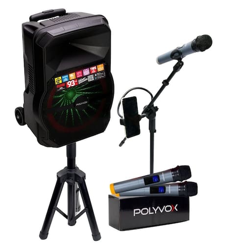Experimente o kit de som completo para eventos da POLYVOX, projetado para proporcionar um som de alta qualidade que impressiona e que você pode levar para onde quiser. Este kit portátil inclui: - 1 caixa de som amplificada Bluetooth com autonomia de bateria, 2 entradas P10 para microfone, guitarra ou violão; - 1 pedestal para microfone; - 2 microfones sem fio Polyvox inclusos; - 1 suporte para caixa de som, que eleva a caixa, evitando as barreiras sonoras e garantindo que o som chegue aonde precisa. Tudo que você precisa para criar uma experiência sonora incrível.