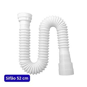 O sifão, com comprimento de 52cm, é fabricado em plástico resistente e flexível, permitindo ajustes para diferentes distâncias entre a cuba e o encanamento da parede. Sua função principal é conduzir a água de forma segura, ao mesmo tempo que cria uma barreira hidráulica que evita o retorno de odores desagradáveis e a entrada de insetos pela tubulação.