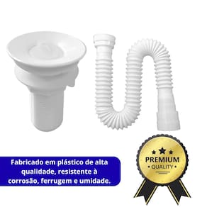 - Sifão flexível: 52cm de comprimento, ajustável conforme necessidade - Material: Plástico de alta resistência, não enferruja - Válvula V8: Modelo sem união, cor branca - Compatibilidade: Padrão para lavatórios, pias e tanques - Função do sifão: Evitar vazamentos, retorno de odores e entrada de insetos - Função da válvula: Controlar o escoamento da água e proporcionar vedação adequada
