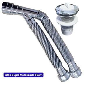 O sifão duplo possui estrutura sanfonada com acabamento metalizado cromado, o que o torna altamente flexível e visualmente atraente. Com 80cm de comprimento, permite o encaixe de duas saídas simultâneas em um único ponto de escoamento, ideal para conectar cubas gêmeas, cubas auxiliares ou até mesmo eletrodomésticos como lava-louças.