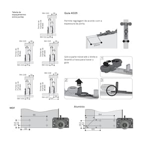 Sistema sobreposto (não exige usinagem) Indicado para armários de médio porte Regulagem de acordo com a espessura da porta Deslizamento suave e estável Trava para fixação segura da porta no guia Instalação prática e rápida Aplicação em móveis residenciais e comerciais Compatível com portas em MDF e alumínio Medidas e Compatibilidade