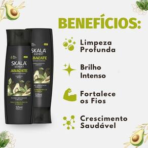 Shampoo: Aplique nos cabelos molhados e massageie suavemente o couro cabeludo com as pontas dos dedos, formando espuma abundante. Enxágue completamente. Para um melhor resultado, repita a operação e use a linha completa Skala Expert Abacate.