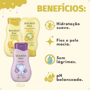 Kit Skalinha Bebê Glicerinado Com Camomila: Shampoo e Condicionador 200ml + Colônia Lavanda 200ml Descubra o cuidado completo e delicado que seu bebê merece com o Kit Skalinha Bebê . Desenvolvido pela SKALA, este conjunto essencial oferece uma rotina de higiene suave e perfumada, ideal para a pele sensível e os cabelos finos dos pequenos. Com a combinação de shampoo glicerinado com camomila, condicionador com camomila e colônia lavanda, este kit proporciona limpeza, hidratação e um aroma agradável, transformando o banho em um momento de carinho e bem-estar.