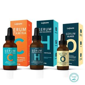 Kit skincare 3 sérum profissional - vitamina c antimarcas + ácido hialurônico antiidade + sérum olhos atenuador olheiras Kit lajeune rotina em 3 passos é o combo de 3 séruns perfeito para deixar sua pele radiante Kit composto por: 1 sérum vitamina c 30ml + 1 sérum ácido hialurônico 30ml + 1 sérum olhos 15ml 1 sérum facial vitamina c: repara clareia e revitaliza2 sérum facial ácido hialurônico: hidrata, suaviza e tonifica3 sérum olhos para a área dos olhos: reduz rugas, atenua olheiras, melhora a elasticidade ademais de ser a textura ideal pre-maquiagem Sérum vitamina c:O envelhecimento e a exposição solar são fatores que afetam a nossa pele que precisa de vitaminas. O sérum de vitamina c lajeune contém nutrientes essenciais para estimular a produção de colágeno, revitalizar e rejuvenescer. Prevenção e redução das rugas e linhas de expressão. Elimina pequenas manchas. Aumenta a elasticidade e o tônus da pele. Um tratamento facial para uso diário, recomendado para todos os tipos de pele, sem deixar seu rosto oleoso Sérum ácido hialurônico:O sérum lajeune contém ácido hialurônico reticulado, o qual tem uma capacidade de retenção de água 50 vezes maior que o ácido hialurônico normal. Estimula a produção de colágeno e elastina, melhorando a matriz da pele, criando um aspecto mais suave, forte e hidratado. Além disso, contém ingredientes naturais que ajudam a reverter o processo de envelhecimento, dando à sua pele um aspecto mais jovem e descansado. Com efeito lifting instantâneo traz uma expressão mais jovem e hidratação profunda e duradoura. Fácil de usar: colocar de 5 a 10 gotas do sérum de vitamina c na palma da mão, aplicar no rosto e pescoço com os dedos, sobre a pele limpa e seca, fazendo movimentos circulares, evitando o contorno dos olhos. Logo após, aplicar o sérum de ácido hialurônico da mesma forma descrita acima.Estes produtos podem ser usados de dia e/ou à noite. Lembre sempre de usar protetor solar durante o dia Sérum controno de olhos:É um corretor anti-idade para a área dos olhos que auxilia na redução de olheiras e rugas. Sua fórmula trabalha para dar aos olhos descanso e sensação de luminosidade. Possui máxima concentração dos ativos para proporcionar a redução de rugas desde a primeira semana de uso, devido à potente ação de renovação celular. Lajeune sérum contorno dos olhos é concentrado em ativos com potente ação antioxidante. Sérum de textura extremamente sedosa. Auxilia ainda a neutralização dos radicais livres proporcionando clareamento, uniformidade e luminosidade à pele. Ele possui uma associação de ativos que ajudam a prevenir e reverter os sinais do envelhecimento; esse dermocosmético age na pele ao redor dos olhos e reduz as rugas mais profundas, deixa a região mais firme e luminosa, proporcionando um rejuvenescimento de dentro para fora. Os resultados já podem ser percebidos desde a primeira semana de uso, devido sua potente ação de renovação celular. Sua embalagem é de fácil aplicação e o produto é indicado para ser utilizado em pele madura para redução de rugas profundas e recuperação da firmeza da pele da área dos olhos. Facil de usar: Na parte da manhã e/ou à noite. Após limpar e tonificar a pele, aplicar partindo da área interior em direção à área exterior dos olhos. Massageie com o dedo, de dentro para fora, para espalhar o produto por toda a região. Uso diário. Todos nossos produtos são formulados com a melhor combinação de ingredientes naturais, selecionamos com cuidado ingredientes que beneficiem a saúde da sua pele e que ajudem a manter a integridade do produto. Fórmulas todas sem parabenos, sem álcoois irritantes, sem silicones, sem corantes nem fragrâncias. Não testados em animaisVeganos Dermatologicamente testados. Feitos no brasil