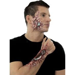 Massa slug: Pode ocorrer algum tipo de alergia Pode ocorrer alergia, caso você tenha sensibilidade a alguns componentes citados acima. Com slug você pode caminhar ao sol sem nenhum tipo de preocupação em relação a reação alérgica, pois ela não contém nenhum tipo de cola ou amônia. Os ingredientes utilizados neste produto são reconhecidamente seguros. Como ocorre em alguns cosméticos, algumas pessoas podem apresentar sensibilidade a algum componente. Recomenda-se aplicar o produto em uma pequena quantidade na parte interna do pulso e removendo-o após 30 minutos. Aconselhamos a usar em crianças acima de 7 anos de idade com o auxilio de um adulto para evitar ingestão acidental. Quanto tempo leva para secar Dependendo da espessura da maquiagem ela seca em aproximadamente 20 minutos. Se tiver utilizado algodão ou gaze ela demora um pouco mais, neste caso você poderá acelerar o processo da secagem com auxilio de secador na temperatura fria e com distância de 30 cm do local aplicado. qual a duração Dura de 1h a 2 horas na pele podendo varias de acordo com o tempo temperatura, ambiente, clima . Ou dependendo dos cuidados de quem está usando como: excesso de suor, ou ficar colocando/ retocando várias vezes, podendo levar a maquiagem a se desmembrar. A maquiagem slug proporciona que o ator/atriz movimente livremente o rosto sem perder as expressões. A massa craquela algum tempo depois de colocada pois como contém água, esta evapora. Para prolongar a durabilidade desta aconselhamos assistir tutoriais no canal terror slug. Lá existem técnicas de algodão e outros mais direcionados a profissionais da área. Como retirar Retirar com água morna e sabão neutro, se quiser, papel higiênico para retirar o excesso e depois um demaquilante também é aconselhável. Usamos também lenços umidecidos. Dicas básicas: Quando fizer uma maquiagem no rosto dos clientes, não esquecer de colocar uma toalhinha para evitar eventuais problemas em relação a pingos. Para realizar a maquiagem deixe sempre um pote pequeno de água para poder molhar aos poucas a espátula ou os dedos para dar acabamento nas laterais Massa Magica . Kit de Maquiagem de Terror para Festas e Teatro, ideal para criar efeitos de queimadura, cortes, feridas e hematomas. Pode ser Utilizado em Peças Teatrais, Festas de Terror, Festa de Halloween, Dia das Bruxas, Truques de Ilusionismo, e também para cobertura de tatuagens. O kit rende de 10 a 15 feridas pequenas. látex: látex centrifugado pré vulcanizado. Utilizado geralmente no auxílio para impermeabilizar a maquiagem/massa, proporcionando cenas externas na chuva, mergulho, etc... Também para prolongar a duração da mesma. Aconselha-se que este produto seja Utilizado por , pois requer muitos cuidados na manipulação. látex de alta qualidade especialmente formulado pra confecção de máscaras e próteses em geral para maquiagem e objetos. Encha o molde de gesso com látex até a boca, deixe descansar por algumas horas, despeje o látex de volta no frasco e deixe o molde de boca pra baixo até que o látex seque por completo, passe talco dentro e fora da peça de látex para que as paredes não grudem entre si.. Para tingir o látex use corantes a base de água. OBS: Cuidado ao fazer uso do látex perto de tecidos e ou roupas, pois ele danifica e não sai mais.