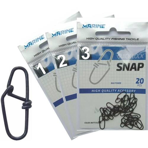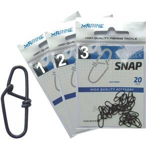 O Quick Lock Snap da Marine Sports é produzido em aço inox de excepcional força e resistência, acabamento em preto fosco e fechamento duplo, com duas voltas reforçadas, o que o torna mais robusto e adequado para os grandes predadores. Disponível em três tamanhos. O Snap da Marine Sports facilita e agiliza a troca de iscas e é o acessório perfeito para os pescadores apaixonados por praticidade e eficiência, este snap de pesca é ideal para diversas modalidades, desde a pesca em água doce ou em água salgada.