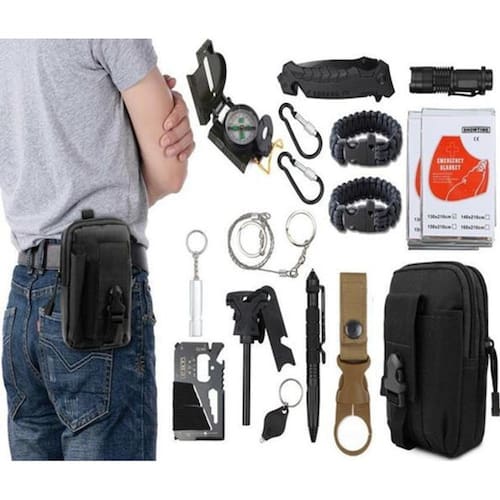 Kit Sobrevivência De Emergência Bolsa Preto 18 Em 1 Pesca Kit de sobrevivência de emergênci Qualquer pessoa pode se encontrar repentinamente em uma situação de emergência, o kit ajuda você a iniciar um incêndio, construir abrigo, sinal para equipes de resgate ou encontrar seu caminho para a segurança, lidar com ferimentos leves e até mesmo pescar Este kit dentro é tudo que você precisa Ferramentas multifuncionais Offer Oferecemos mais com um cobertor de emergência para salvar vidas para manter 90% do calor corporal no interior usos ilimitados: abrigo, cobertura do solo, isolamento, sombra, sinal de emergência, permanecer seco na chuva, sobrevivência ao ar livre, prevenção de hipotermia ou Corda manual. Duas cordas manuais multifuncionais uma preta + uma cor camuflada , duas mosquetão, fivela para chaleira, serra circular e lentes refletoras Combo prático de atualizaçã Faca de táticas aprimorada, corpo da mina com dentes serrilhados, pode ser Utilizado para martelo de resgate de janela quebrada, faca de corda cortada, função de abridor de garrafas E cartão de sabre atualizado mais conveniente de usar Fácil de transporta Com bolsa Molle, este equipamento pode ter uma capacidade maior e pode ser carregado com acessórios ou ferramentas adicionais quando você sai, isso é extremamente útil em seu carro, caminhão, barco, monte na sua bicicleta, possibilidade infinita Gift Presente perfeito para todo Este é realmente um presente prático e significativo para os seus entes queridos, prepare seus familiares e amigos bem antes de qualquer emergência, ensine habilidades de sobrevivência a seus filhos, crie atividades educacionais e divertidas durante a temporada de férias com nosso profissional Kit projetado Descrição do Produto Característica: 1. atualizada Corpo da mina com dentes serrilhados, pode usar para martelo de resgate de janela quebrada, faca de corda cortada, função de abridor de garrafas 2. Pulseira Carabiner Cobertor Térmico de Emergência Cobertor térmico Mantém 90% do calor corporal no interior durante desastres frios. Pulseira de grau militar ajustável pode disparar, ajudar a apitar, mina de emergência, bússola, pesca. 3.Pederneira Fire Starter Feito de magnésio e ferro, 5000-12000 vezes para atirar fogo. Peso leve, economia de espaço e fácil de transportar, com as funções Flint Opener Bottle Scraper 3. Aplicável em qualquer lugar, a qualquer hora e em qualquer condição. 4. Caneta de sobrevivência de emergência Feito de aço de tungstênio Para maior resistência e portabilidade, quebre uma janela vidro e escape em uma situação de emergência. A caneta perfeita para quem gosta de sobreviver, caçar ou ao ar livre, bem como pessoal militar ou de serviços de emergência. Especificação: Tamanho: 16,1 x 10 x 8,5 cm 6,3 x 4 x 3,3 polegadas Peso: 780g 1,6 libras Conteúdo do pacote: 2 x manta térmica de emergência 2 x pulseira Paracord com Flintstone 2 x mosquetão 1 x Flintstones 1 x raspador multifuncional 1 x caneta de aço de tungstênio de emergência 1 x lanterna 1 x nova bússola 1 x mini luz portátil 1 x táticas 1 x cartão de sabre multifuncional preto 1 x anel de tração viu 1 x apito de buraco duplo de alta frequência 1 x fivela de chaleira 1 x Bolsa Molle Cor Preto