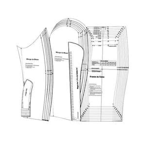 Frente de calça Costas da calça Régua de 1/4 para a cinturar Régua saia e calça Manga do blazer superior Manga do blazer inferior Colarinho da camisa Frente camisa Costa camisa Manga da camisa Frente da blusa Costas da blusa Manga da blusa Gola militar Gola esporte Gola italiana