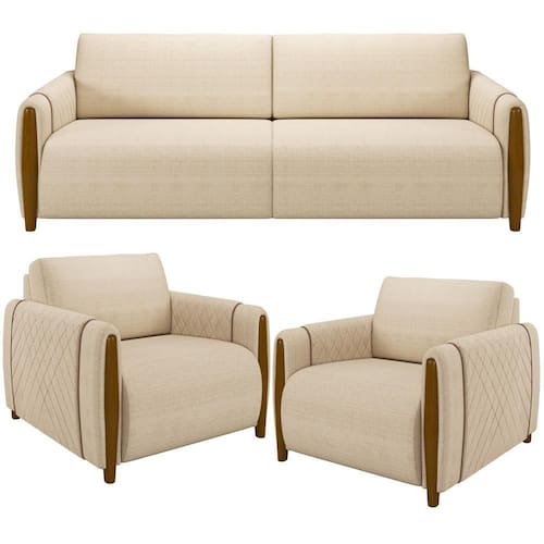 Kit Sofá 02 Lugares Sala Estar 168cm Com 02 Poltronas Flora Pés Madeira M03 Linho Bege - Lyam Decor O Kit de Sofá com Poltrona Flora promete marcar com elegancia e versatilidade á presença em diversos estilos de decoracao. O modelo certo é essencial para o bom funcionamento dos cômodos da casa, por isso, um sofá bem estruturado é mais do que necessário na sala de estar! O design aconchegante se destaca junto aos pés madeirados e o revestimento em linho! Extremamente elegante, que transmite a nobreza que ele precisa! Tudo isso para gerar conforto para você e sua família em uma peça única feita com todo cuidado e observada nos detalhes para superar as suas expectativas! Adquira o seu! Dimensões do Sofá (L x A x P) 168 x 90 x 93 cm Dimensões da Poltrona (L x A x P) 98 x 74 x 88 cm Medidas Internas: Altura do encosto: 39 cm Altura do assento: 47 cm Largura do braço: 23 cm Profundidade Livre Do Assento: 53 cm Largura do braço: 25 cm Altura dos pés: 17 cm Características: Estrutura em madeira de reflorestamento, imunizada contra mofo. Revestimento em Linho na cor Bege. Encosto fixo almofadado com fibras e flocos resvestida com kami e manta acrílica e assento com espuma D-26. Pés em madeira tingida. Acabamento em Kami. Suporta até 120 kg por assento. - Por se tratar de estofado as medidas podem ter uma pequena variação de até 3 cm. - A tonalidade do produto real poderá ter ligeira variação devido o lote de tecidos. Produto entregue montado. Indicado para residencial, sua limpeza deve ser feita com pano umedecido em água limpa, sem esfregar, não utilizar produtos abrasivos, desengordurantes, álcool ou solvente. Nunca sentar nos braços ou encosto do produto. Manter em lugar livre de umidade e/ou exposição direta ao sol. Observações importantes: - Produto para residencial em ambiente interno, não devendo ficar exposto diretamente ao sol, calor e umidade excessivos. - Pode haver alguma diferença de tonalidade entre a imagem e o produto real, por conta do tratamento de imagens e a calibração de cores do seu monitor. - As imagens são meramente ilustrativas, não acompanham objetos de decoração e eletrônicos. - Ao receber a mercadoria, o cliente deve verificar as condições da embalagem, caso haja alguma não assine o comprovante de recebimento. - Montagem, desmontagem e outras instalações serão de responsabilidade do cliente. Não nos responsabilizamos, no ato da , por subir escadas/elevadores ou pelo transporte por guincho em apartamentos. Eventuais despesas são de responsabilidade do comprador. - Confira as dimensões do produto e certifique-se de que passará normalmente por supostos elevadores, portas, escadas e/ou corredores de sua residência. NA
