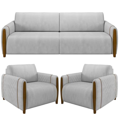 Kit Sofá 02 Lugares Sala Estar 168cm Com 02 Poltronas Flora Pés Madeira M03 Veludo Cinza - Lyam Decor O Kit de Sofá com Poltrona Flora promete marcar com elegancia e versatilidade á presença em diversos estilos de decoracao. O modelo certo é essencial para o bom funcionamento dos cômodos da casa, por isso, um sofá bem estruturado é mais do que necessário na sala de estar! O design aconchegante se destaca junto aos pés madeirados e o revestimento em veludo! Extremamente elegante, que transmite a nobreza que ele precisa! Tudo isso para gerar conforto para você e sua família em uma peça única feita com todo cuidado e observada nos detalhes para superar as suas expectativas! Adquira o seu! Dimensões do Sofá (L x A x P) 168 x 90 x 93 cm Dimensões da Poltrona (L x A x P) 98 x 74 x 88 cm Medidas Internas: Altura do encosto: 39 cm Altura do assento: 47 cm Largura do braço: 23 cm Profundidade Livre Do Assento: 53 cm Largura do braço: 25 cm Altura dos pés: 17 cm Características: Estrutura em madeira de reflorestamento, imunizada contra mofo. Revestimento em Veludo na cor Cinza. Encosto fixo almofadado com fibras e flocos resvestida com kami e manta acrílica e assento com espuma D-26. Pés em madeira tingida. Acabamento em Kami. Suporta até 120 kg por assento. - Por se tratar de estofado as medidas podem ter uma pequena variação de até 3 cm. - A tonalidade do produto real poderá ter ligeira variação devido o lote de tecidos. Produto entregue montado. Indicado para uso residencial, sua limpeza deve ser feita com pano umedecido em água limpa, sem esfregar, não utilizar produtos abrasivos, desengordurantes, álcool ou solvente. Nunca sentar nos braços ou encosto do produto. Manter em lugar livre de umidade e/ou exposição direta ao sol. Observações importantes: - Produto para uso residencial em ambiente interno, não devendo ficar exposto diretamente ao sol, calor e umidade excessivos. - Pode haver alguma diferença de tonalidade entre a imagem e o produto real, por conta do tratamento de imagens e a calibração de cores do seu monitor. - As imagens são meramente ilustrativas, não acompanham objetos de decoração e eletrônicos. - Ao receber a mercadoria, o cliente deve verificar as condições da embalagem, caso haja alguma não assine o de . - Montagem, desmontagem e outras instalações serão de responsabilidade do cliente. Não nos responsabilizamos, no ato da , por subir escadas/elevadores ou pelo por guincho em apartamentos. Eventuais despesas são de responsabilidade do comprador. - Confira as dimensões do produto e certifique-se de que passará normalmente por supostos elevadores, portas, escadas e/ou corredores de sua residência. NA