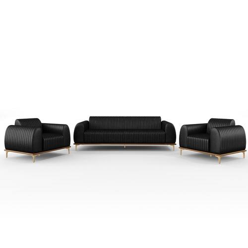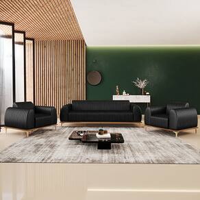 Madeira de eucalipto tratado, MDF, OSB, couríssimo, espuma D-23, espuma D-28, percintas elásticas de Nylon, alumínioCom bastante personalidade e beleza ímpar o Kit Sofá 2 Lugares 150cm Com 2 Poltronas Molino Pés D'ouro D02 Couríssimo Preto B-159 - Lyam Decor vem para requintar ainda mais sua decoração. Amplamente sofisticado, é ideal se você está buscando por peças elegantes e confortáveis. Possui acabamentos impecáveis, é estruturado em madeira de eucalipto tratado, unidas com grampos galvanizados, base envernizada e pés de alumínio com metalização na cor D’Ouro que o tornam ainda mais atraente e convidativo.