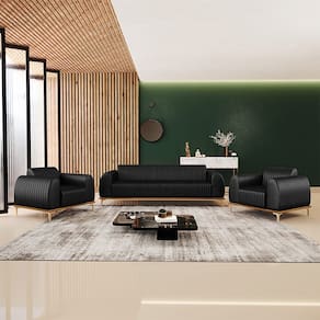 Madeira de eucalipto tratado | Couríssimo | AlumínioCom bastante personalidade e beleza ímpar o Kit Sofá 3 Lugares 210cm Com 2 Poltronas Molino Pés D'ouro D02 Couríssimo Preto B-159 - Lyam Decor vem para requintar ainda mais sua decoração. Amplamente sofisticado, é ideal se você está buscando por peças elegantes e confortáveis. Possui acabamentos impecáveis, é estruturado em madeira de eucalipto tratado, unidas com grampos galvanizados, base envernizada e pés de alumínio com metalização na cor D’Ouro que o tornam ainda mais atraente e convidativo.