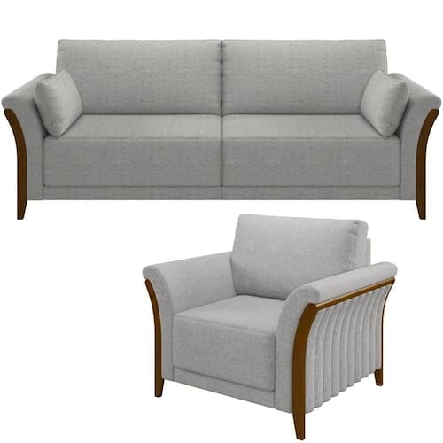 Kit Sofá 3 Lugares Sala Estar 222 Com Poltrona Stefan Pés Madeira M03 Linho Cinza - Lyam Decor O Kit de sofá com poltrona Stefan promete marcar com elegancia e versatilidade á presença em diversos estilos de decoracao. O modelo certo é essencial para o bom funcionamento dos cômodos da casa, por isso, um sofá bem estruturado é mais do que necessário na sala de estar! O design aconchegante se destaca junto aos pés madeirados e o revestimento em linho! Extremamente elegante, que transmite a nobreza que ele precisa! Tudo isso para gerar conforto para você e sua família em uma peça única feita com todo cuidado e observada nos detalhes para superar as suas expectativas! Adquira o seu! Dimensões do Sofá (L x A x P) 222 x 88 x 88 cm Dimensões da Poltrona (L x A x P) 102 x 88 x 88 cm Características: Estrutura em madeira de reflorestamento, imunizada contra mofo. Revestimento em Linho na cor Cinza. Sustentação do assento com cintas elásticas de alta resistência. Encosto fixo almofada com fibras e flocos, revestido com kami e manta acrílica, assento com espuma D-26. Suporta até 120 kg por assento. Pés e braços em Madeira Tingidos. - Por se tratar de estofado as medidas podem ter uma pequena variação de até 3 cm. - A tonalidade do produto real poderá ter ligeira variação devido o lote de tecidos. Produto entregue montado. Indicado para residencial, sua limpeza deve ser feita com pano umedecido em água limpa, sem esfregar, não utilizar produtos abrasivos, desengordurantes, álcool ou solvente. Nunca sentar nos braços ou encosto do produto. Manter em lugar livre de umidade e/ou exposição direta ao sol. Observações importantes: - Produto para residencial em ambiente interno, não devendo ficar exposto diretamente ao sol, calor e umidade excessivos. - Pode haver alguma diferença de tonalidade entre a imagem e o produto real, por conta do tratamento de imagens e a calibração de cores do seu monitor. - As imagens são meramente ilustrativas, não acompanham objetos de decoração e eletrônicos. - Ao receber a mercadoria, o cliente deve verificar as condições da embalagem, caso haja alguma não assine o comprovante de recebimento. - Montagem, desmontagem e outras instalações serão de responsabilidade do cliente. Não nos responsabilizamos, no ato da , por subir escadas/elevadores ou pelo transporte por guincho em apartamentos. Eventuais despesas são de responsabilidade do comprador. - Confira as dimensões do produto e certifique-se de que passará normalmente por supostos elevadores, portas, escadas e/ou corredores de sua residência. NA
