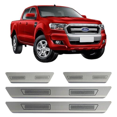 Kit soleira porta aço inox escovado ford nova ranger Soleira de porta em aço inox com acabamento em aço escovado. Proporciona uma área extra de preservação para a pintura de seu carro. Aumentando o cuidado contra riscos e arranhões, e ainda dando um estilo esportivo ao seu veículo.