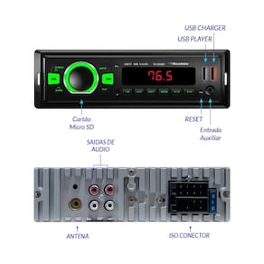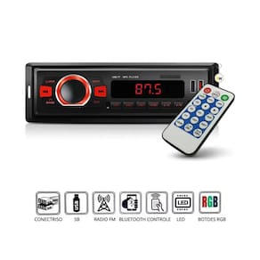 Especificações Auto Rádio: Saídas: 4 RCA Conexões: Bluetooth Visor: LED VERMELHO Tipo de Conector: ISO Potência: 4 Canais de 48 Watts RMS Controle Remoto: Físico e por aplicativo Controles: Graves, Agudos e Balanço dos Canais Rádio: FM (76~108Mhz) com memória para 18 estações FM Entradas: Micro SD, Auxiliar e 2 USB´s (1 Charger e 1 Player) Painel: Fixo com botões em 7 cores de iluminação (azul, azul claro, branco, amarelo, vermelho, roxo e verde)