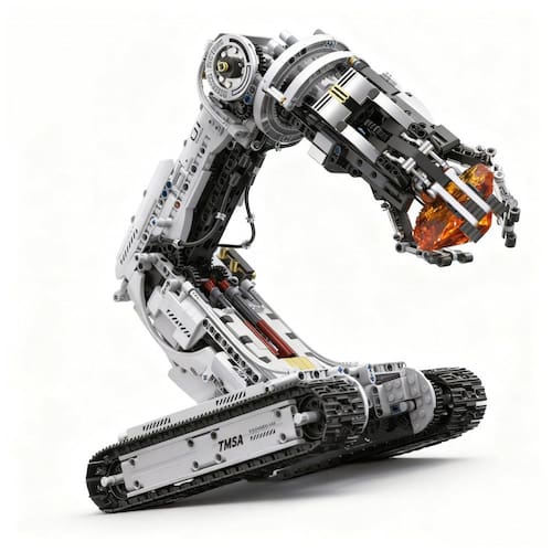 O kit Technical Tracked Robot Arm da UNCLE BRICK é um conjunto de blocos de montar com 1468 peças que permite construir um braço robótico motorizado sobre esteiras, com funções completas de locomoção e preensão. O modelo utiliza uma base tipo tanque com esteiras para movimentação para frente, para trás, giros em U e rotações laterais, além de um braço articulado que gira até 90 graus e uma garra que abre e fecha mais de 180 graus. O sistema é alimentado por caixa de bateria de íons de lítio e controlado por quatro motores M, com operação via controle remoto e também por aplicativo, tornando o modelo adequado tanto para exibição quanto para uso diário em brincadeiras de controle.