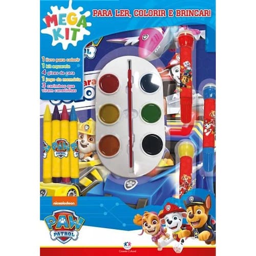 O kit conta com um livro para ler e colorir, onde as crianças poderão se divertir colorindo os desenhos dos personagens da Patrulha Canina. Além disso, o kit acompanha gizes de cera, uma paleta de aquarela com seis cores, canetinhas com carimbos acoplados e um jogo para recortar e brincar.