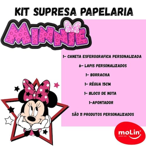 Kit Surpresa Papelaria Minnie - Molin O Kit Surpresa Papelaria Minnie é a escolha perfeita para quem deseja unir praticidade, qualidade e o encanto da personagem mais amada da Disney. Desenvolvido pela marca Molin, referência em produtos de papelaria, este kit traz itens exclusivos e personalizados que tornam o dia a dia escolar ou muito mais divertido e organizado. Cada caixa é composta por 11 produtos cuidadosamente selecionados, todos com estampa temática da Minnie. Entre os itens que podem ser encontrados estão: uma caneta esferográfica personalizada com tinta azul, seis lápis decorados, uma borracha, uma régua de 15 cm, um bloco de notas e um apontador. A composição pode variar de acordo com a edição da caixa, mas sempre mantendo o padrão de qualidade Molin e o design alegre e colorido que remete ao universo da Disney. Além da utilidade prática, este kit se destaca pelo visual encantador que estimula a criatividade e torna as tarefas diárias mais prazerosas. É uma ótima opção de presente para crianças, adolescentes e até mesmo adultos que são fãs da Minnie, podendo ser tanto em sala de aula quanto no escritório ou em casa. O Kit Surpresa Papelaria Minnie também é uma excelente alternativa para quem deseja presentear em datas comemorativas, como aniversários, Dia das Crianças ou Natal, oferecendo uma experiência única de receber itens variados e colecionáveis. Seja para estudar, trabalhar ou simplesmente se encantar com a fofura dos produtos, este kit é de praticidade, diversão e muito estilo. Marca: Não Informado