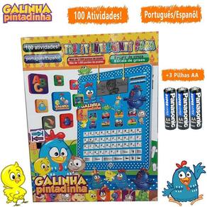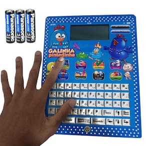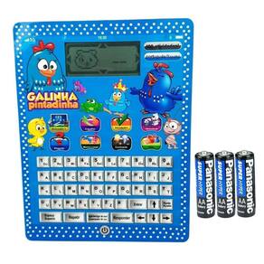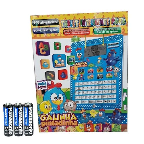Kit Tablet Infantil Galinha Pintadinha Educativo Ensina Soletrar Contas Matemáticas com Visor Pixel + 3 Pilhas AA Descrição:O Tablet Didático Infantil é cheio de atividades. Com uma tela de pixel, irá trazer muita diversão para as crianças com várias atividades educativas como alfabeto, números, notas musicais, que animal é esse, completa palavras, que letra falta, além de musiquinhas. esse Tablet Didático Infantil tem um visual divertido e moderno e ajuda a criança a desenvolver raciocínio logico e criatividade com as 100 atividades divertidas. O tablet didático também proporciona a opção de utilizar o áudio em espanhol, o que torna tudo mais incrível O tablet infantil contém as seguintes funções: - Aprendizagem.- Questão- Matemática.- Música & Jogo Características:- Modelo: Galinha Pintadinha - Pilhas: Utiliza 3 pilhas 1.5 AA - Material: Plástico e componentes eletrônicos - Categoria: Jogos- Tela com mais de 1.000 pontos de pixels- Audio em português e espanhol Itens inclusos: - 1 Tablet de Brinquedo - 1 manual - 3 Pilhas AADimensões: :- Produto: 20 x 25 cm- Embalagem: 24 x 19 x 4 cm- Peso: 0,30 kg INMETRO: CE-BRI/IQB 005352 51821/18-004