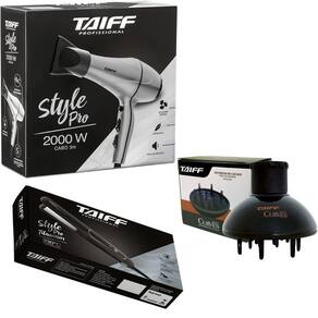 SECADOR DE CABELO PROFISSIONAL TAIFF STYLE PRO 2000W PRATA - 220VIdeal para uso profissionalCabo de 3 metrosPotência de 2000WVoltagem -220vCaracterística/AçãoMotor AC ProfissionalCHAPINHA PRANCHA ALISADORA TAIFF STYLE PRATA PRO TITANIUM 230ºC - BIVOLT-Temperatura de 230°c – Ideal para processos químicos;- Perfil de Titanium: Melhor desempenho para progressivas;- Aquecimento instantâneo;- Amortecimento em silicone;- Aquecimento PTC;- Botão liga e desliga indicado em Led;- Cabo de 3 metros de comprimento ;- Leve e ergonômica;- Bivolt automático.DIFUSOR DE AR CURVES TAIFFDimensões do produto com embalagem (compr. x alt.): 153 x 146 mm