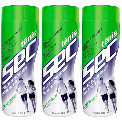 O Talco Tênis Sec Canforado possui fórmula exclusiva de fácil aplicação, desenvolvida para manter os pés secos e perfumados. Proporciona conforto, praticidade, protege contra a transpiração e os odores causados pelos materiais sintéticos dos calçados. Mantém os pés secos, perfumados e com suave sensação de frescor.