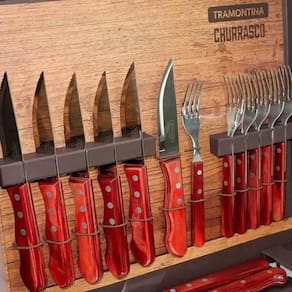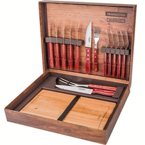 Kit para Churrasco Tramontina Aço Inox Madeira Polywood Vermelha 15 peças Talheres Jumbo e Tábua.
