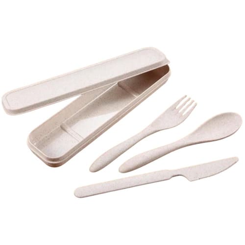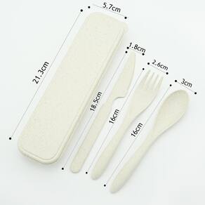 O kit de talheres reutilizáveis são feitos de fibra de Palha de Trigo. O kit contém um garfo, uma colher, uma faca e um estojo para guardar e carregar para o trabalho ou viagens, todos do mesmo material. Os produtos são antibacterianos, sustentáveis, fáceis de limpar, resistentes e possuem uma longa durabilidade.