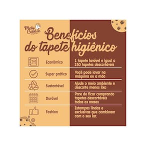 - mais econômico e sustentável, equivale a 250 tapetes descartáveis; - possui durabilidade de até 200 lavagens; - prático, pode ser lavado à mão e também na máquina de lavar; - personalizado. Disponível em até 3 tamanhos para cães de pequeno, médio e grande porte e fluxos variados volume do xixi fraco a intenso ; - até 48 horas de máxima eficiência sem odor mantendo o ambiente limpo ; - antiderrapante. Não escorrega; - super estiloso e bonito, suas bordas estampadas garantem um charme a mais na decoração, deixando o espaço do seu pet mais colorido e autêntico.