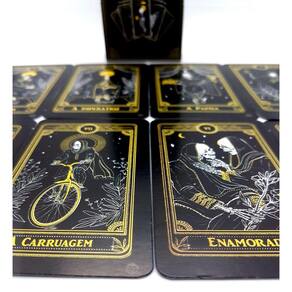 As cartas são lindas, com ilustrações impressionantes, simples e sofisticado, com boa leitura, com personagens misteriosos e estilosos, figuras com crânios e esqueletos com tons em preto, dourado e branco. Boa qualidade de impressão, resolução Ilustrações bem definidas. Ótimo deslize, portanto, são mais difíceis de amassar.