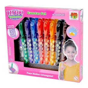 Kit Tatuagem Temporária Infantil - Tattoo Collection - Canetas Gel - DM Toys: as crianças podem incrementar o estilo com a linha Tattoo Collection! Com 08 stencils adesivos de formatos diferentes e 08 cores de caneta colorida para fazer lindas tatuagens e arrasar no visual! As tatuagens temporárias Tattoo Collection da DM Toys são lúdicas, coloridas, atóxicas e divertidas. Aprovadas pelo INMETRO, são perfeitas para divertir a criançada e mexer com a imaginação. Detalhes: • Um conjunto para criar tatuagens coloridas temporárias • O produto é totalmente seguro para a pele • As tatuagens são facilmente laváveis com água e sabão • 08 stencils adesivos de formatos diferentes • 08 cores de caneta gel coloridas Informações: • Produto: Kit Canetas Gel Tattoo Collection • Marca: DM Toys • Coleção: Tattoo Collection • Tipo: Canetas Gel para Tatuagem • Categoria: Beleza e Moda Infantil • Subcategoria: Tatuagens Infantis • Conteúdo: - 08 canetas gel de tatuagem - 08 stencils adesivos • Recomendação: para crianças a partir de 05 anos de idade Especificações: • Referência: DMT6571 • Código de Barras: 7899205965718 • Embalagem (C x A x L): 22 cm x 20 x 03 cm • Embalagem (Peso): 0.174 kg • Material / Composição: - Canetas: água, glicerina, conservantes, espessantes e corantes. Ponta metálica - Stencil adesivo: PVC • Registro: 003 965/2023 • Certificado: Órgãos Autorizados - OCP´S (Organismos de Certificação de Produtos) Aviso: • As imagens são meramente ilustrativas • Os pesos, tamanhos e medidas são aproximados • As cores e estampas dos produtos podem ter variações • As informações são de responsabilidade do fabricante ou fornecedor Ean: 7899205965718