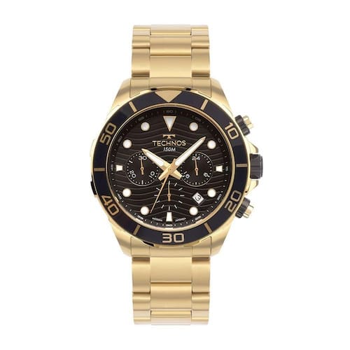 plaintext_description_meli - Kit Technos Masculino Acqua Dourado - JS25BBX/1PA Technos apresenta uma coleção exclusiva, em homenagem a Torben Grael, maior medalhista da história do Brasil e ícone da vela mundial. Com cinco medalhas, Torben Grael fez história, trazendo dois ouros, uma prata e dois bronzes para o Brasil. Inspirada nessas conquistas, a coleção é composta por cinco modelos, cada um simbolizando uma medalha conquistada pelo velejador ao longo dos anos. Os modelos acompanham um estojo especial e uma medalha comemorativa inspirada em cada conquista. Com design náutico, a coleção conta com aro externo giratório unidirecional com aplicação de alumínio, que facilita o manuseio do relógio mesmo com luvas, além dos ponteiros e marcadores de hora luminescentes, que possibilitam a leitura das horas mesmo em condições submersas. Seu mostrador ainda apresenta a aplicação de uma elegante textura inspirada no oceano. Essa textura oceânica também está presente no estojo especial, desenvolvido exclusivamente para essa coleção, e nas medalhas comemorativas que acompanham cada relógio. A coleção ainda conta com a presença da assinatura do Torben Grael gravada no fundo do relógio e no estojo especial. Produto 100% em aço inoxidável, com máquina quartz japonesa Miyota, calendário, cronógrafo e resistência à água de até 150 metros. Acompanha estojo especial e medalha comemorativa.