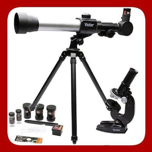 Kit telescópio e microscópio vivitar modelo vivtelmic20. Telescópio de refração com ampliação de 20 x/30x/40x e lente com 50mm, possui bússola com pontos cardeais para orientação direcional.