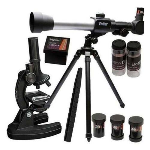 Kit telescópio e microscópio vivitar modelo vivtelmic20. Telescópio de refração com ampliação de 20 x/30x/40x e lente com 50mm, possui bússola com pontos cardeais para orientação direcional.