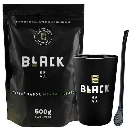 Kit Tereré Erva Menta E Limão + Copo Preto + Bomba Preta Black Erva Erva Mate Tereré Black Erva 500g Sabor Menta E Limão O Tereré possui efeito diurético, que colabora no processo de redução da gordura corporal. A bebida estimula o aumento o gasto energético dos consumidores, por proporcionar maior força muscular e, consequentemente, melhor desempenho nos treinos. Se você gosta de refrescância e sabor inconparável, não pode deixar de provar esse sabor. A erva menta e limão combina o sabor do limão com a deliciosa sensação da hortelã. Pacote com 500g com sistema zip lock para maior conservação do produto. Modo de Preparo: - Coloque 3/4 de Black Erva na guampa, cuia ou copo. - Incline e acomode a Black Erva sobre um lado da guampa, cuia ou copo. Deixe a bomba no local adequado. - Tome com água gelada a gosto e saboreie sua Black Erva. Consumir com água gelada para melhor aproveito do sabor. ESPECIFICAÇÕES TÉCNICAS: - Marca: Black Erva - Ilexx paraguariensis Erva Mate , Aroma Artificial de Menta, Aroma Artificial de Limão - Padronização Erva Mate Folha 35% mínimo, outras partes do ramo 65% máximo - Não contém glúten Copo Cuia Para Terere Black Erva Preto Fosco 350ml Para você que quer apreciar uma deliciosa erva mate, sozinho ou com seus amigos, com essa cuia você vai fazer isso no maior estilo A cuia possui a aparência Preta com a estampa da marca Black Erva. Possui a superfície lisa e fácil de limpar. ESPECIFICAÇÕES TÉCNICAS: - Produto com ótimo acabamento - Resistente e com alta durabilidade - Material: Acrílico - Capacidade: 350ml - Altura: 11,5cm - Diâmetro Boca: 8cm - Peso: 60g Bomba Para Tereré E Chimarrão Tradicional Black Erva Preto A Black Erva é o novo conceito para terere no Brasil, com produtos de alta qualidade Essa bomba tradicional e prática possui grande durabilidade e é extremamente bonita. Pode ser Utilizado para o consumo de Erva Mate aonde você estiver: seja entre amigos, no trabalho ou em casa. ESPECIFICAÇÕES TÉCNICAS: - Material de alta qualidade e pintura epóxi um revestimento de alta resistência - É de fácil utilização e limpeza, não acumula cheiro ou resíduos - Anti entupimento - Medidas: 19 x 2 cm - Cor: Preto ITENS INCLUSOS: - 1x Erva Mate Tereré Black Erva 500g Sabor Menta E Limão - 1x Copo Cuia Para Terere Black Erva Preto Fosco 350ml - 1x Bomba Para Tereré E Chimarrão Tradicional Black Erva Preto